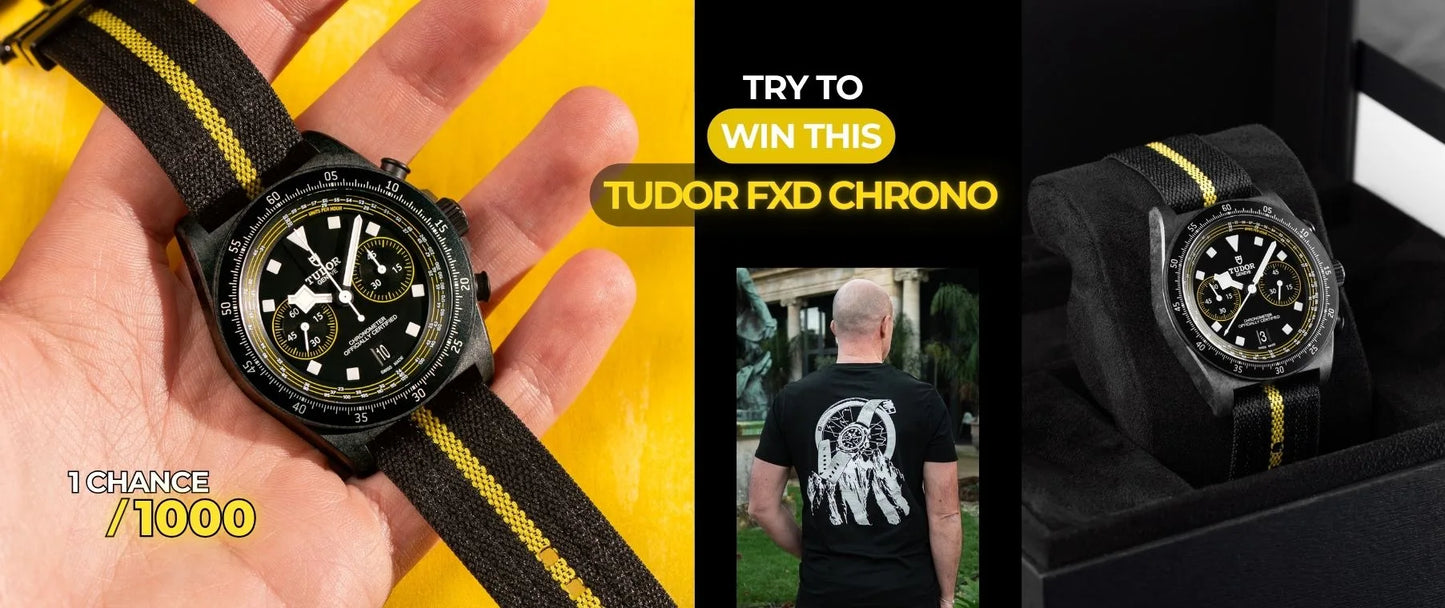 Win a Tudor Chrono FXD “Yellow” (€5,490, limited to 300 pieces) with 8 ZEALANDE NATO straps, or one of two additional prizes (4 NATO straps or 1 rubber strap of your choice). Every T-shirt or Poster purchase automatically enters you into the prize draw.