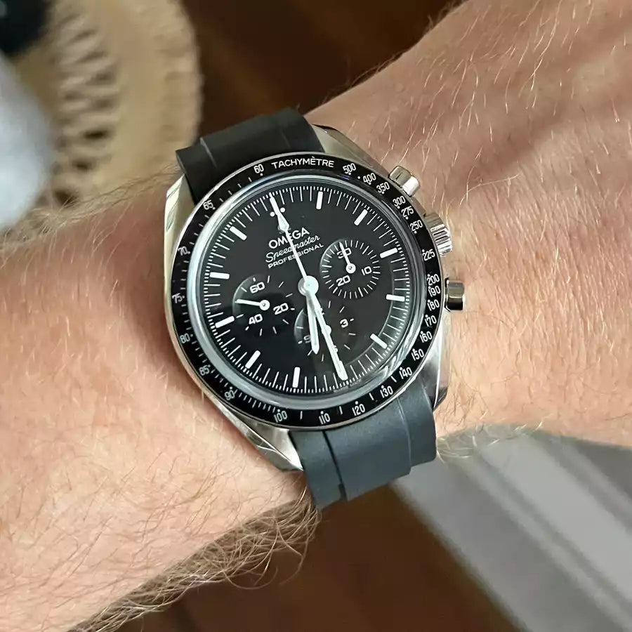 Das Gehäuse dieses neuen Modells ist etwas dicker als das des regulären Modells, da es ein komplexeres Uhrwerk aufnehmen muss. Das Gehäuse hat jetzt einen Durchmesser von 43 mm, was nur 1 mm mehr ist als beim klassischen Modell, und eine Gehäusedicke von 13,6 mm statt 13,2 mm. Obwohl diese Größenzunahme groß erscheinen mag, trägt sich die Mondphase dank des eleganten Armbands, das sich um das Handgelenk schmiegt, immer noch wunderbar. Omega garantiert zwar weiterhin eine Wasserdichtigkeit von 50 Metern, dennoch ist es immer ein Risiko, einen Chronographen ins Wasser zu nehmen, da mehr Löcher vorhanden sind, durch die Wasser eindringen kann, insbesondere wenn er keine verschraubte Krone hat!