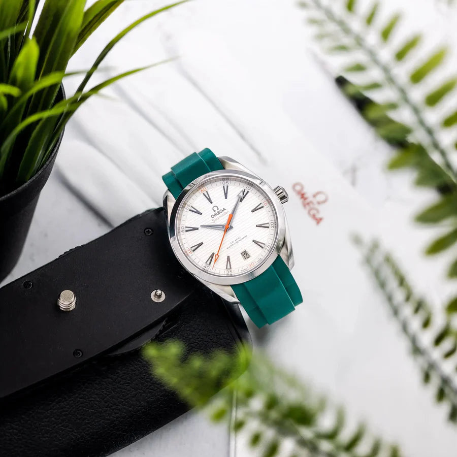 En les observant de plus près, vous remarquerez qu'Omega les fabrique à partir de mélanges de caoutchouc vulcanisé résistant aux UV, à la corrosion par l'eau salée et aux températures extrêmes. Cela leur garantit un aspect neuf pendant de nombreuses années, peu importe combien vous les portez. Omega ne se contente pas de proposer un simple morceau de caoutchouc à enfiler autour du poignet : la marque prend le temps de concevoir méticuleusement les finitions du bracelet en caoutchouc pour qu'il s'intègre parfaitement au design de la montre. Des motifs ondulés des bracelets Seamaster au gaufrage façon toile de voile des modèles Aqua Terra , ces surfaces ajoutent profondeur visuelle et attrait tactile. De nombreux bracelets s'intègrent directement au boîtier, offrant un ajustement parfait et une répartition uniforme du poids sur le poignet. Cela confère également un look plus haut de gamme, le bracelet étant clairement conçu pour ce modèle spécifique. Une seule montre peut passer du pont d'un yacht au bar à cocktails simplement en l'associant à une option en caoutchouc souple. En bref, Omega a élevé le caoutchouc du statut d'utilitaire à celui d'ambitieux.
